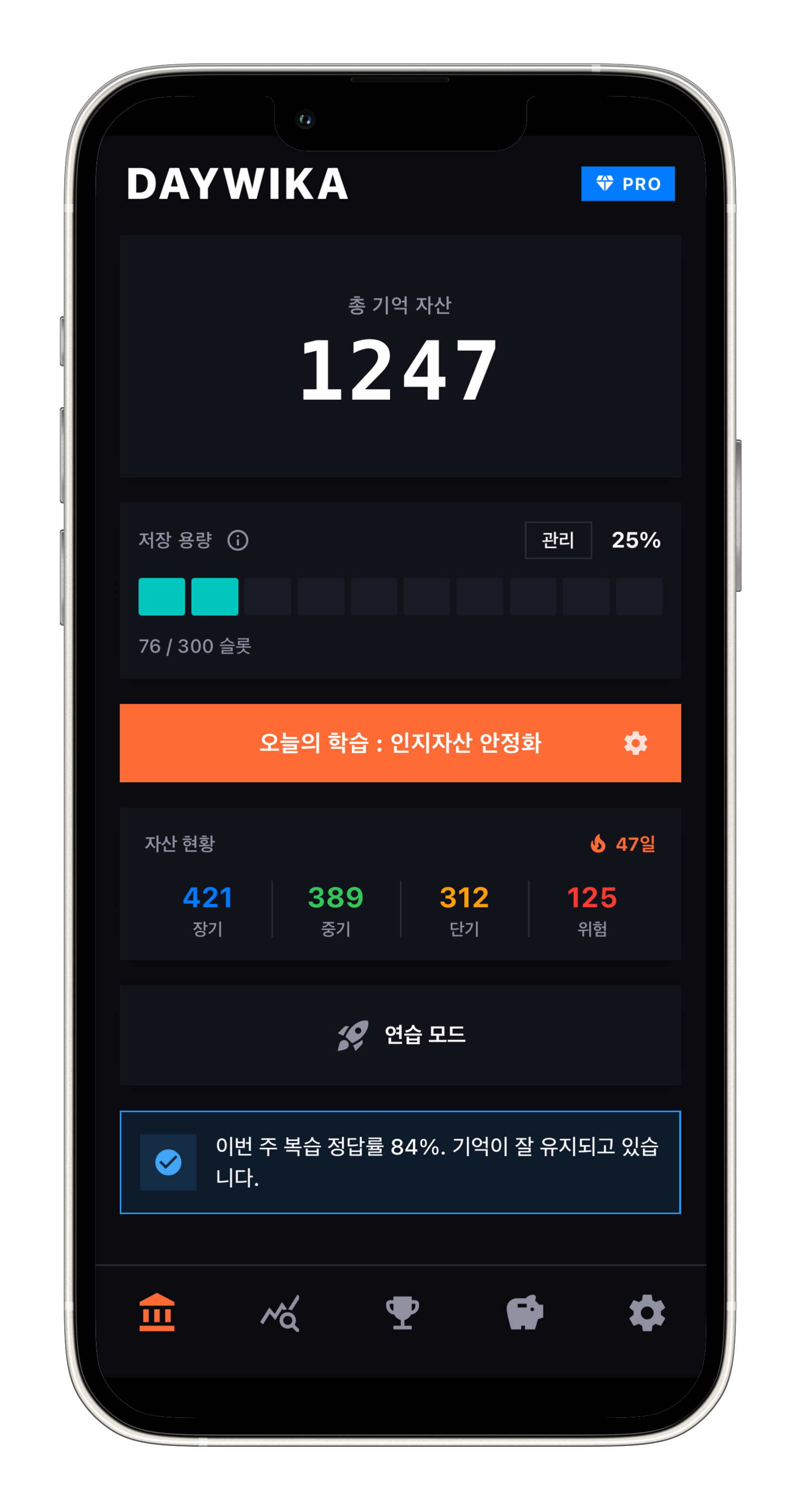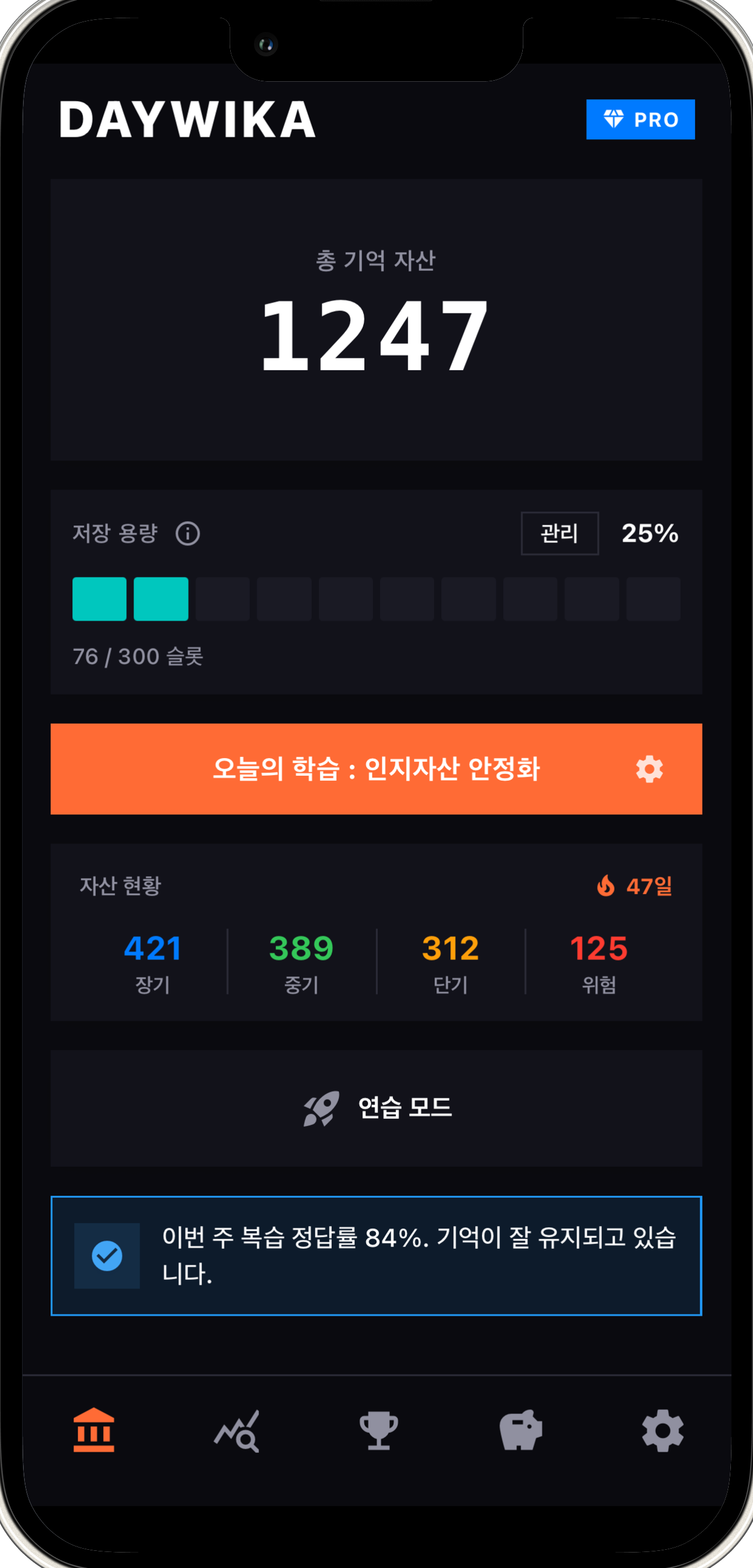 자산현황 리포트, 7일 성과 차트, 심층 AI 분석. 기억 상태와 위험 수준별로 분류된 인지 포트폴리오를 핀테크 대시보드처럼 확인하세요.
